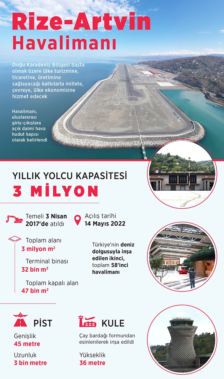 3 milyon metrekare alanda inşa edilen Rize-Artvin Havalimanı, 45 metre genişlik ve 3 bin metre uzunluğundaki pistiyle bölgenin hava yolu ulaşımı ihtiyaçlarını eksiksiz karşılayacak.
