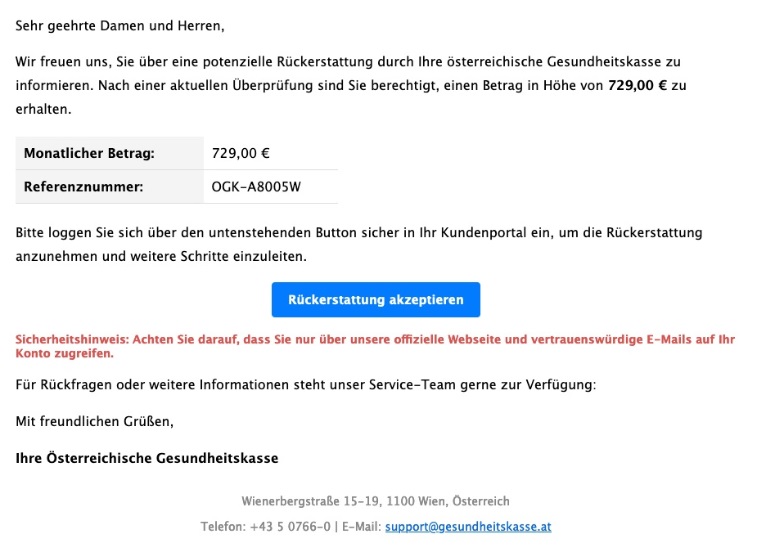 Son dönemde, Avusturya Sağlık Sigortası (ÖGK) ve Sosyal Sigorta Kurumu (ÖSV) adına gönderilen sahte e-postalar, binlerce kişiyi hedef alıyor. Mesajlarda, 729 Euro’ya kadar iade edileceği iddia edilerek kişisel bilgilerin paylaşılması isteniyor. Ancak bu mesajlar tamamen phishing (oltalama) amaçlı dolandırıcılık girişimleridir.