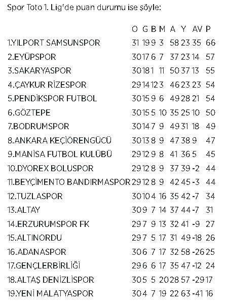 Normal sezonu ilk 2 sırada bitirecek ekibin direkt Süper Lig'e yükseleceği ligde bu haftayı bay geçecek Samsun ekibi, kalan 5 haftada Kahramanmaraş merkezli depremlerden etkilenen Adanaspor ve Yeni Malatyaspor'la yapacağı müsabakalarda, rakiplerinin çekilmesi nedeniyle hükmen galip sayılacak.