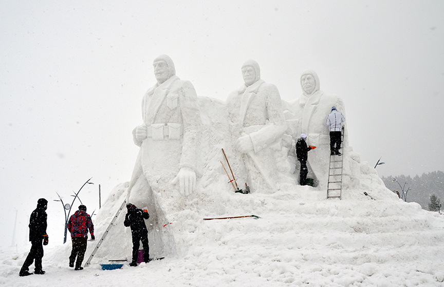 Oteller bölgesindeki kardan yontulara kar yağışı altında son rötuşlar yapıldı.