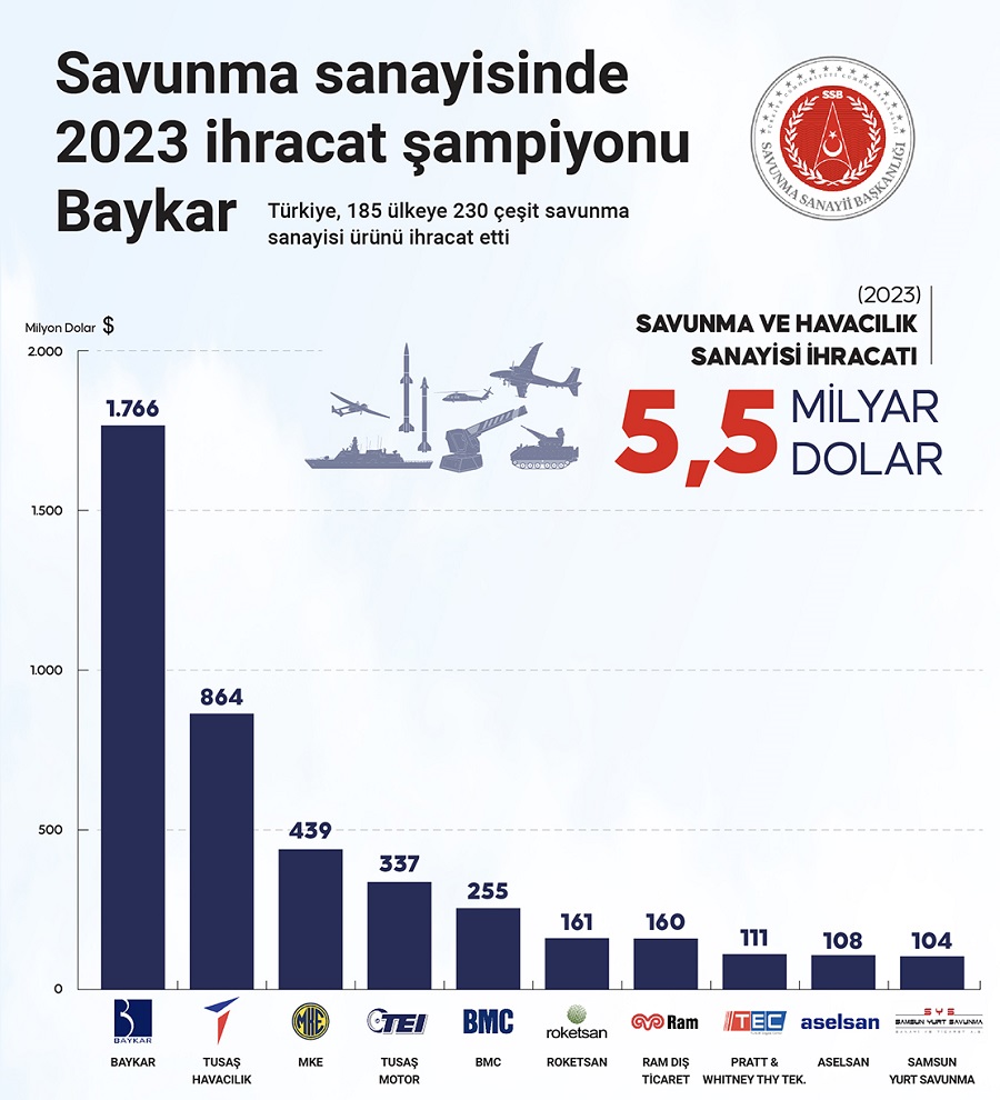 Görgün'ün paylaşımına göre, 2023'te en fazla ihracat yapan Türk savunma ve havacılık sanayisi şirketleri ve ihracat miktarları şöyle: