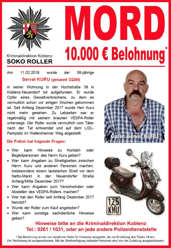 Almanya'nın Koblenz kentinde 11 Şubat Pazar günü evinde cesedi bulunan ve cinayete kurban gittiği anlaşılan Servet Kuru'nun (58) katil veya katillerini bulmak için polis 10.000 Euro ödül koydu.