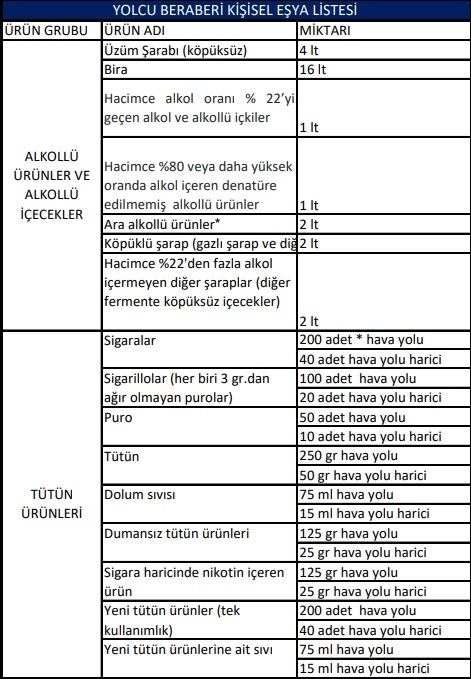 - Sigara: Kişi başı hava yolu 200 adet, kara yolu 40 adet getirme hakkınız olduğunu unutmayınız,