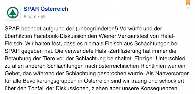 ‘’Biz SPAR’da kesinlikle hiçbir zaman uyuşturulmadan kesilmiş et ürünlerinin satışa sunmadığımızı bildirmek isteriz. Helal sertifikası her zaman hayvanların kesilmeden önce uyuşturulduğunu içermekteydi. Avusturya usulüne göre tek fark kesim işlemini yapılırken okunan duadır. Avusturya’da yaşayan tüm nüfus grupları için, tedarikçi olarak üzgünüz. Sosyal medyada yer alan eleştirilerin seviyesi karşısında şoktayız, fakat sonuçları kabul etmeliyiz’’