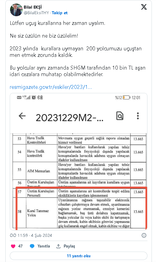 Bilal Ekşi paylaşımında, “Lütfen uçuş kurallarına her zaman uyalım. Ne siz üzülün ne biz üzülelim! 2023 yılında kurallara uymayan 200 yolcumuzu uçuştan men etmek zorunda kaldık. Bu yolcular aynı zamanda SHGM tarafından 10 bin TL aşan idari cezalara muhatap olabilmektedirler” dedi.