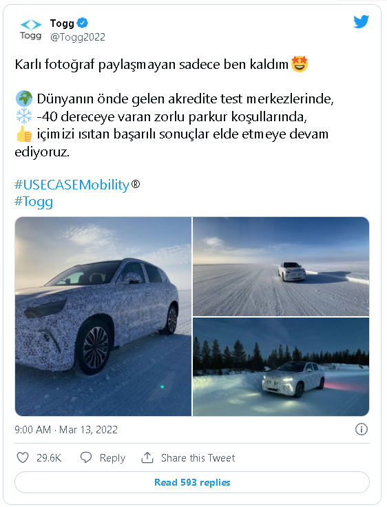 Togg'un resmi Twitter hesabından yapılan paylaşımda, "Karlı fotoğraf paylaşmayan sadece ben kaldım. Dünyanın önde gelen akredite test merkezlerinde, eksi 40 dereceye varan zorlu parkur koşullarında, içimizi ısıtan başarılı sonuçlar elde etmeye devam ediyoruz." ifadeleri kullanıldı.