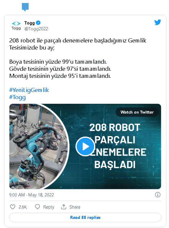 Yüzde 97'si tamamlanan gövde binasındaki 208 robot, parçasız denemelerden sonra hücre bazında parçalı denemelere başladı. Bu aşamayı, hücreleri bir araya getirilerek yapılacak deneme üretimleri izleyecek. Bu süreç de tamamlandıktan sonra yılın son çeyreğinde seri üretime hazır hale gelinecek.