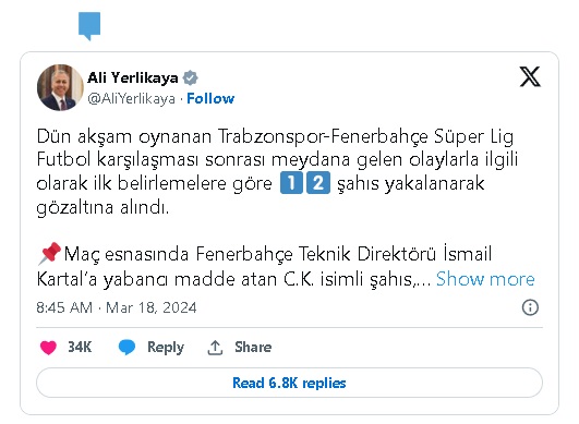 Bakan Yerlikaya, sosyal medya hesabından yaptığı paylaşımda, maç esnasında Fenerbahçe Teknik Direktörü İsmail Kartal'a yabancı madde atan C.K'nin müsabaka esnasında tespit edilip, gözaltına alındığını ve hakkında gerekli soruşturmanın başlatıldığını belirterek, şunları kaydetti:
