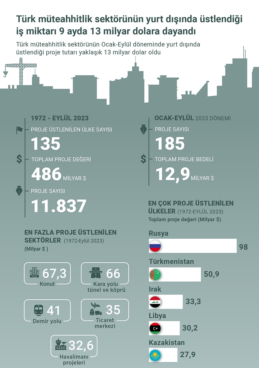 Yurt dışı müteahhitlik sektörü, 1972'den eylül ayı sonuna kadar ise 135 ülkede 486 milyar dolar değerinde 11 bin 837 proje üstlendi.