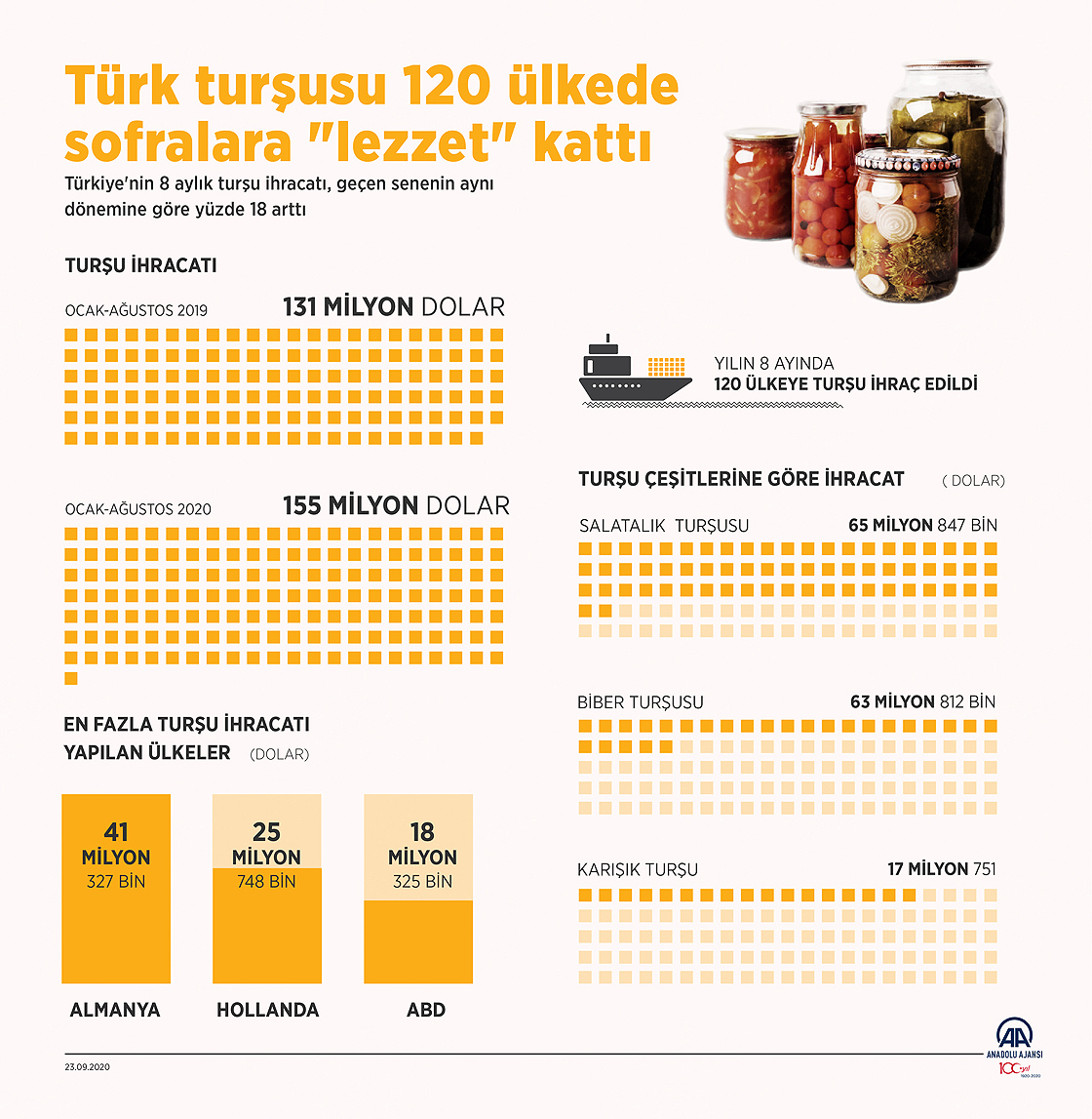 Bu yıl yeni tip koronavirüsün (Kovid-19) de etkisiyle talebin arttığı turşuda 8 aylık dönemdeki ihracat, geçen yılın aynı dönemine göre yüzde 18 artarak 131 milyon dolardan 155 milyon dolara çıktı.
