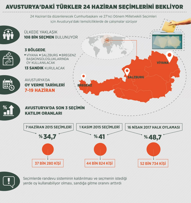 Seçmenler, daha önce 10 Ağustos 2014'te cumhurbaşkanlığı seçimi, 7 Haziran ve 1 Kasım 2015 genel seçimleri ile 16 Nisan 2017'de yapılan Anayasa değişikliği referandumunda oy vermişti. Avusturya’daki Türk seçmenler 24 Haziran'da Cumhurbaşkanı ve 27. Dönem Milletvekili Genel Seçimleri için oy kullanmak için beşinci kez sandığa gitmiş olacak.
