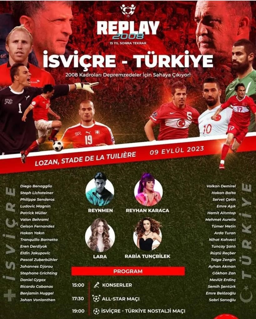 Geliri, adıyla oynanacak maçın ve etkinliklerin geliri, Hatayspor’un alt yapısı olmak üzere deprem bölgesinde zarar gören futbol alt yapı tesislerine için aktarılacak olan REPLAY 2008 her iki ülkenin futbol federasyonları tarafından da destekleniyor. Ayrıca REPLAY 2008 Futbol federasyonu danışmanı Cüneyt Yalınkılıç ve Batı İsviçre Türkiye Dernekleri Federasyonu Başkan Yardımcısı Metin Karagülle öncülüğünde, bir dayanışma etkinliği olacak.
