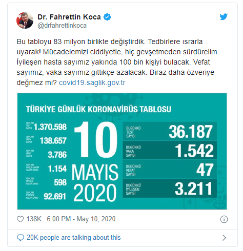 Sağlık Bakanı Fahrettin Koca ise Twitter hesabındaki paylaşımında, "Bu tabloyu 83 milyon birlikte değiştirdik. Tedbirlere ısrarla uyarak, mücadelemizi ciddiyetle hiç gevşetmeden sürdürelim. İyileşen hasta sayımız yakında 100 bin kişiyi bulacak. Vefat sayımız, vaka sayımız gittikçe azalacak. Biraz daha özveriye değmez mi?" ifadesini kullandı.