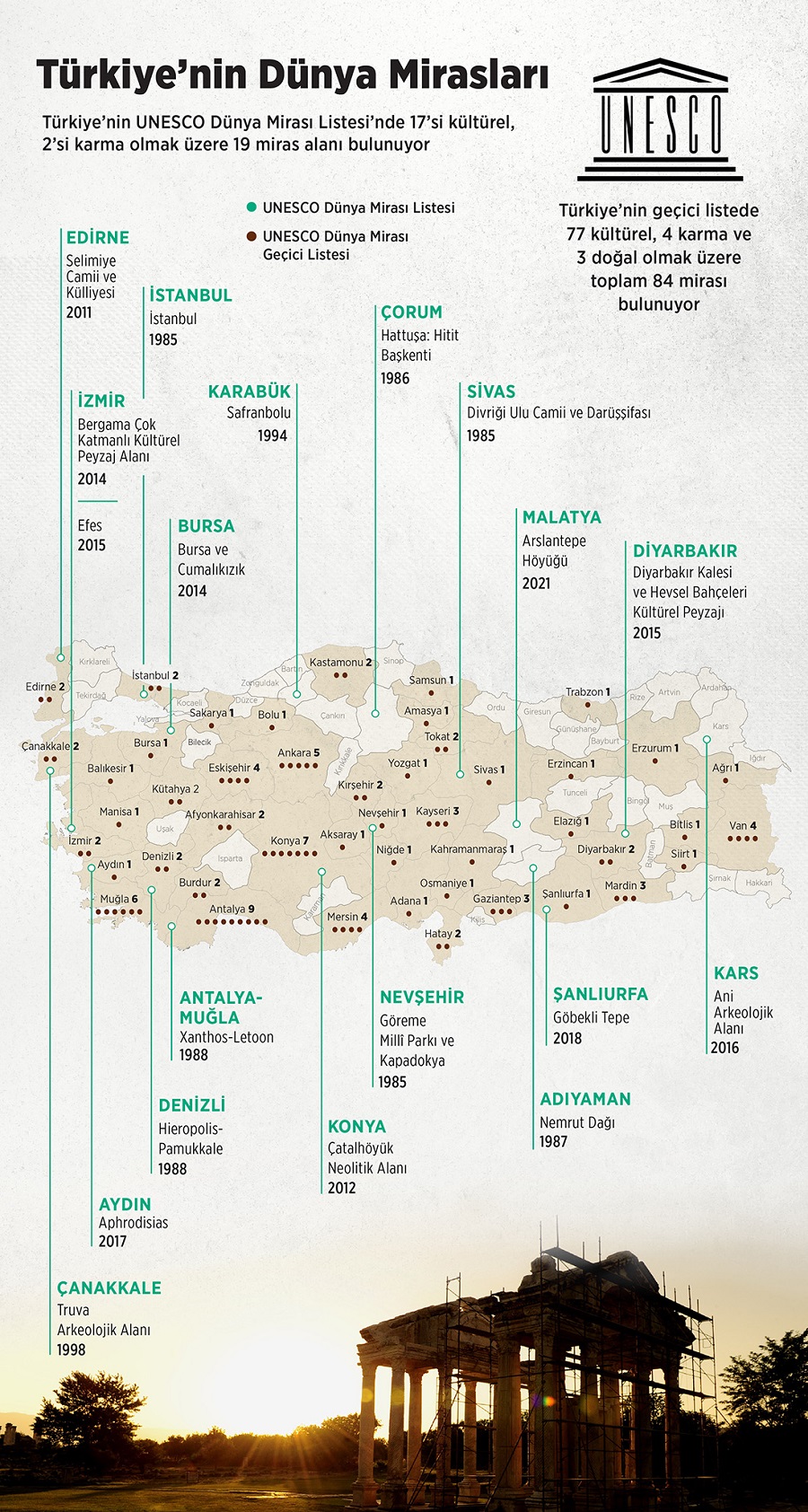 Gerekli belgelerin UNESCO Genel Merkezi’ne sunulmasıyla Türkiye Sözleşmeye 16.03.1983 tarihinde resmen taraf olmuştur. 1972 Dünya Kültürel ve Doğal Mirasının Korunması Sözleşmesi’ne göre oluşturulan ve Dünya Mirası Komitesi (DMK) tarafından belirlenen Dünya Mirası Listesi'nde Dünya Miras Alanı olarak ilan edilen 1154 miras yer almaktadır. Bunlardan 897’si kültürel, 218’i doğal ve 39’u karma (doğal ve kültürel) miraslardır. Türkiye’nin bu listede 17’si kültürel, 2’si karma olmak üzere 19 miras alanı bulunmaktadır: