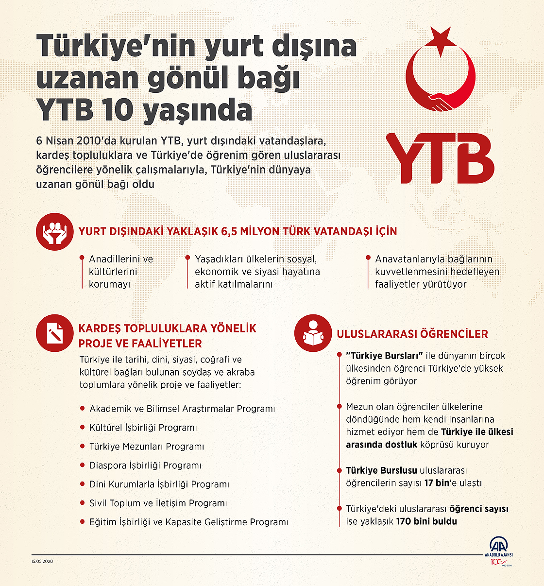 Yurtdışı Türkler ve Akraba Topluluklar Başkanlığı (YTB), kuruluşundan bu yana geçen 10 yılda, bir yandan yurt dışında yaşayan Türklerin kültürel kimliklerinin korunup geliştirilmesine yönelik faaliyetler yürütürken, diğer yandan Türkiye'yi uluslararası öğrenciler için eğitim alanında bir cazibe merkezi haline getirdi.