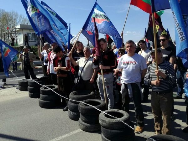 Ellerinde Bulgaristan bayrakları taşıyan protestocular, karayoluna zincir çekip, araç lastikleriyle barikat oluşturdu.