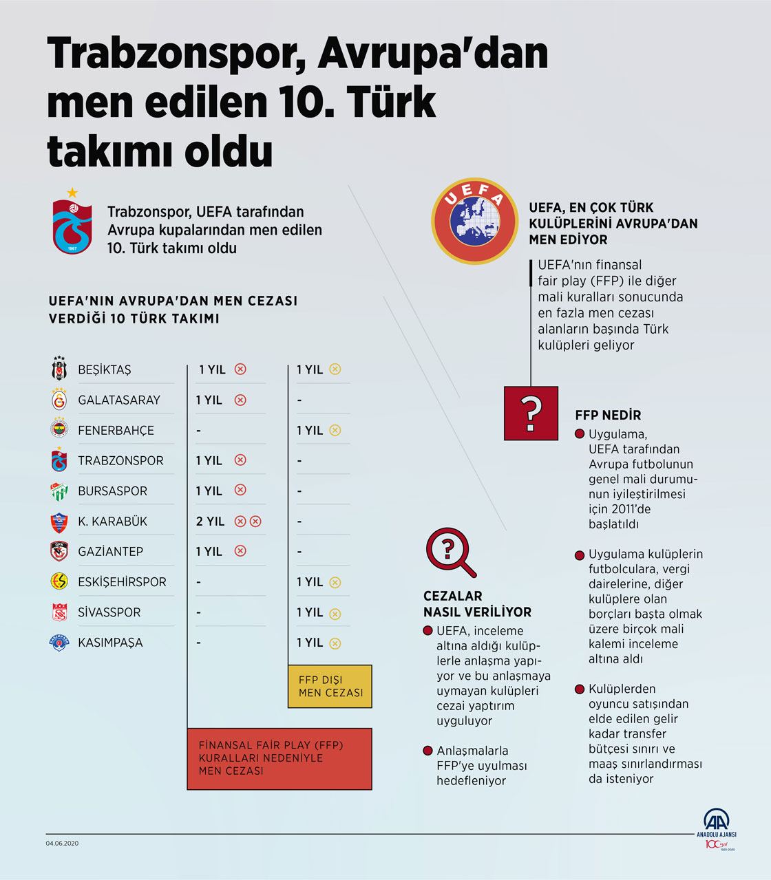 UEFA'nın 2011 yılında başlattığı FFP kuralları ve mali kriterler kapsamında Galatasaray, Beşiktaş, Gaziantepspor, Bursaspor, Kardemir Karabükspor ve dün de Trabzonspor olmak üzere 6 Türk takımı Avrupa müsabakalarından men cezası aldı.