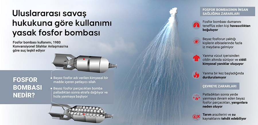 Uluslararası hukuka göre yoğun sivil nüfusun bulunduğu bölgelerde kullanımı yasak olan beyaz fosforun dumanı, teneffüs edildiğinde ciğerlerde ani yaraların oluşmasına ve nefessiz kalarak boğulmaya yol açabiliyor.