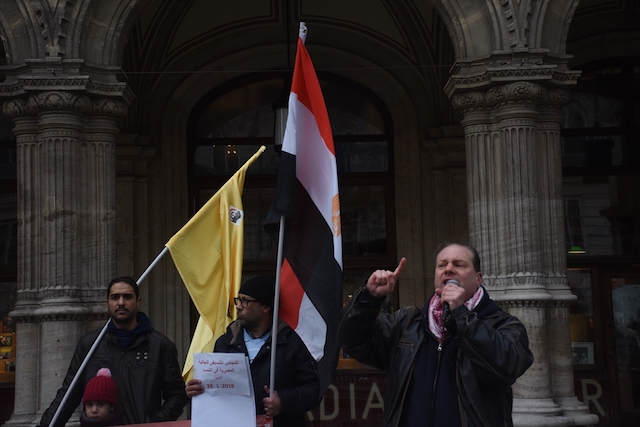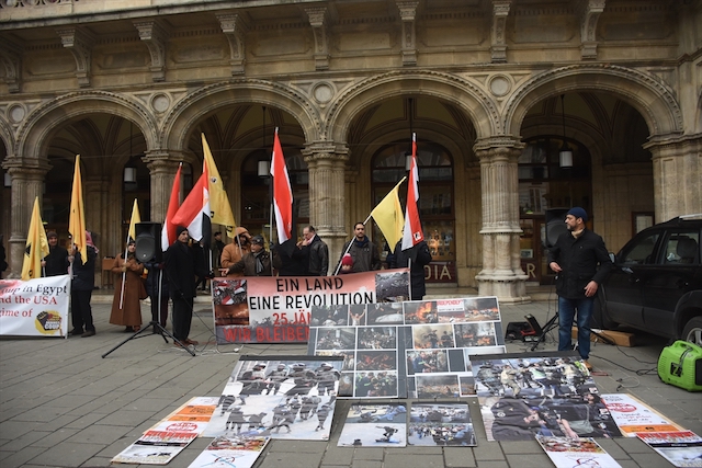 Avusturya'nın başkenti Viyana'da bir grup, 25 Ocak 2011'de Mısır’da gerçekleştirilen devrimin yıl dönümünde, ülkede askeri darbe ile yönetimi ele geçiren Cumhurbaşkanı Abdulfettah es-Sisi’yi protesto etti.
