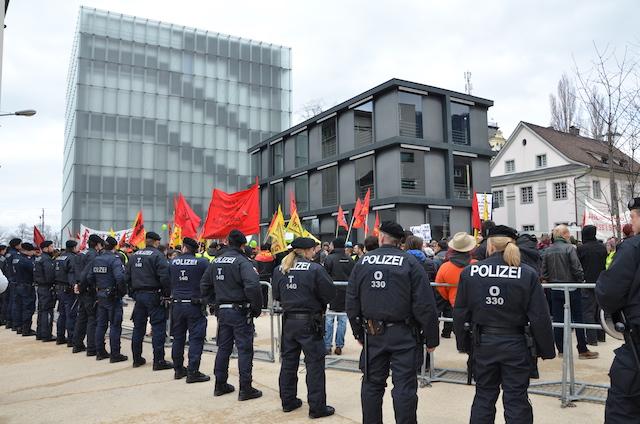 Yaklaşık 600 kişilik bir gurup saat 12:15 itibarı ile PEGİDA karşıtı sloganlar eşliğinde Bahnhof-Sahil yolu-Belrupstrasse-Anton Schneider Strasse güzergâhı üzerinden Kornmarktplatz önünde bulunan Sanat Merkezi'nin (Kunsthaus) önünde toplanarak yaklaşık iki saat kadar sloganlar atarak, ırkçılığı, faşizmi ve İslam düşmanlığını kınadı.