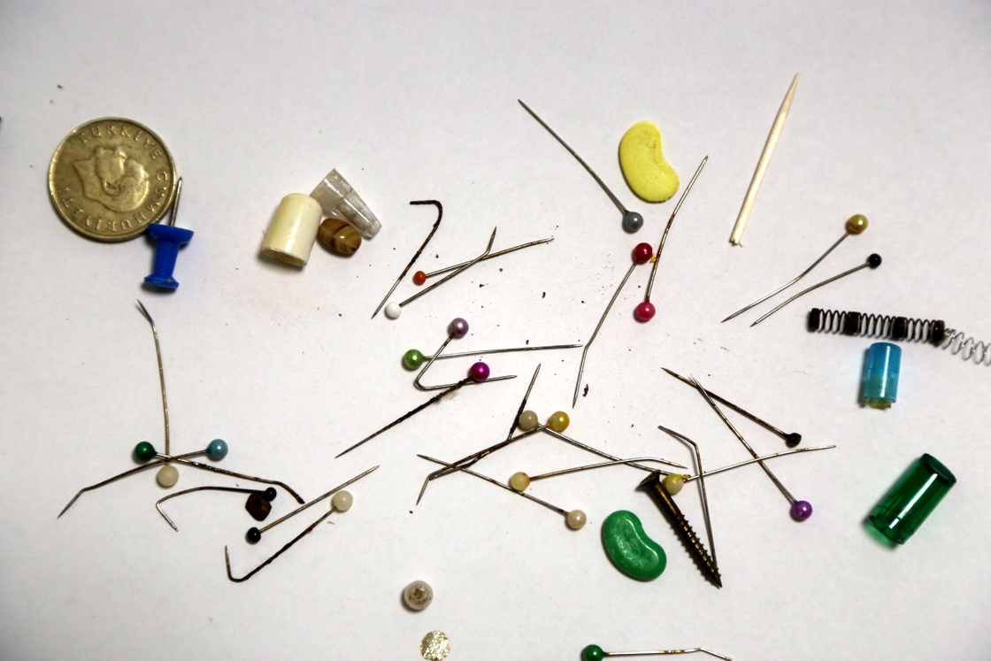 Yanlışlıkla yutulan cisimlerin bazılarından yıllar önce koleksiyon oluşturmaya başlayan Sivas Cumhuriyet Üniversitesi Tıp Fakültesi Göğüs Cerrahisi Ana Bilim Dalı Bölüm Başkanı Prof. Dr. Ekber Şahin'in mide ve nefes borusundan çıkardıkları arasında çok sayıda toplu iğnenin yanı sıra raptiye, çivi, madeni para, kalem kapağı, oyuncak fasulye, künye, düğme yer alıyor.
