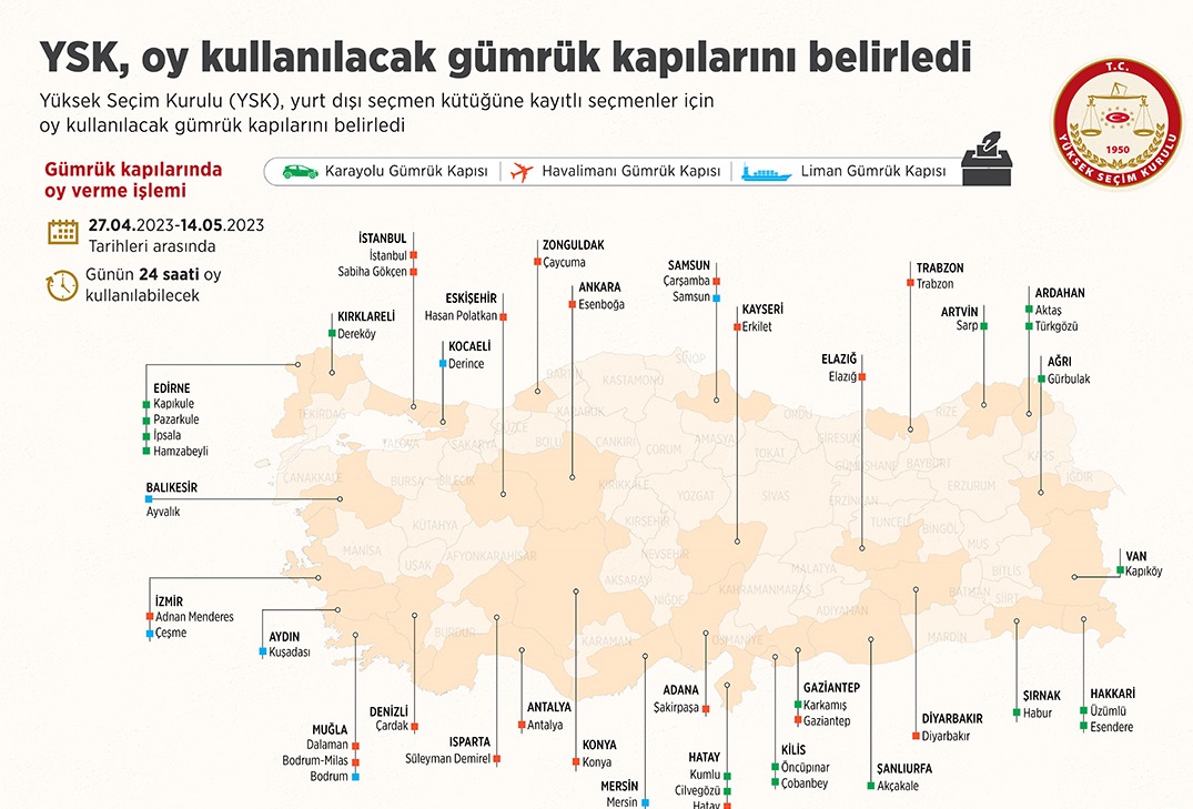 YSK'nin Cumhurbaşkanı Seçimi ve 28. Dönem Milletvekili Genel Seçimi'nde oy kullanılacak gümrük kapılarına ilişkin kararı yayımlandı.