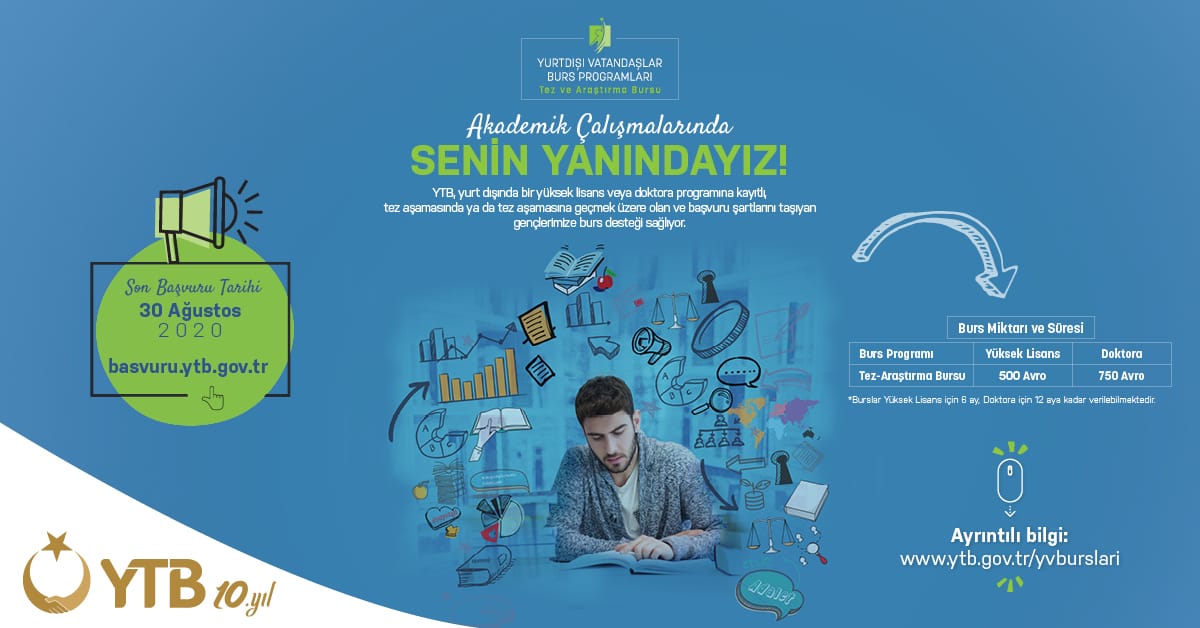 YTB tarafından yurt dışında yaşayan vatandaşların eğitim ve akademik çalışmalarını desteklemek maksadıyla bu yıl uygun görülen yüksek lisans ve doktora tezleri destekleniyor. Söz konusu burslar ile yurt dışında yaşayan vatandaşları ilgilendiren konularda yapılan akademik çalışmaların sayısının ve niteliğinin arttırılması hedefleniyor. Halihazırda tez yazan ya da başlayacak olan adaylara tez dönemlerinde yüksek lisans için altı aya, doktora için on iki aya kadar burs sağlanacak.