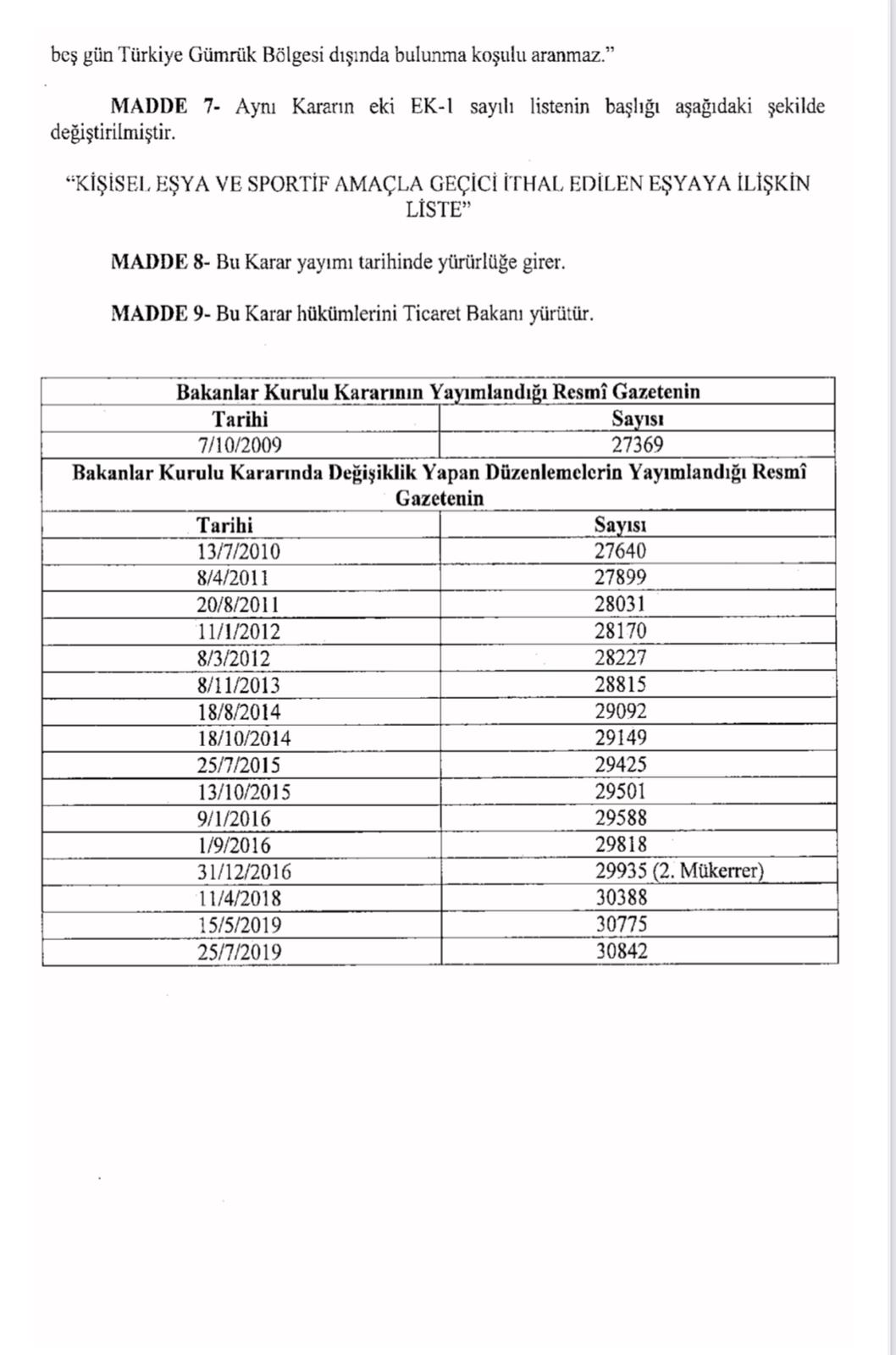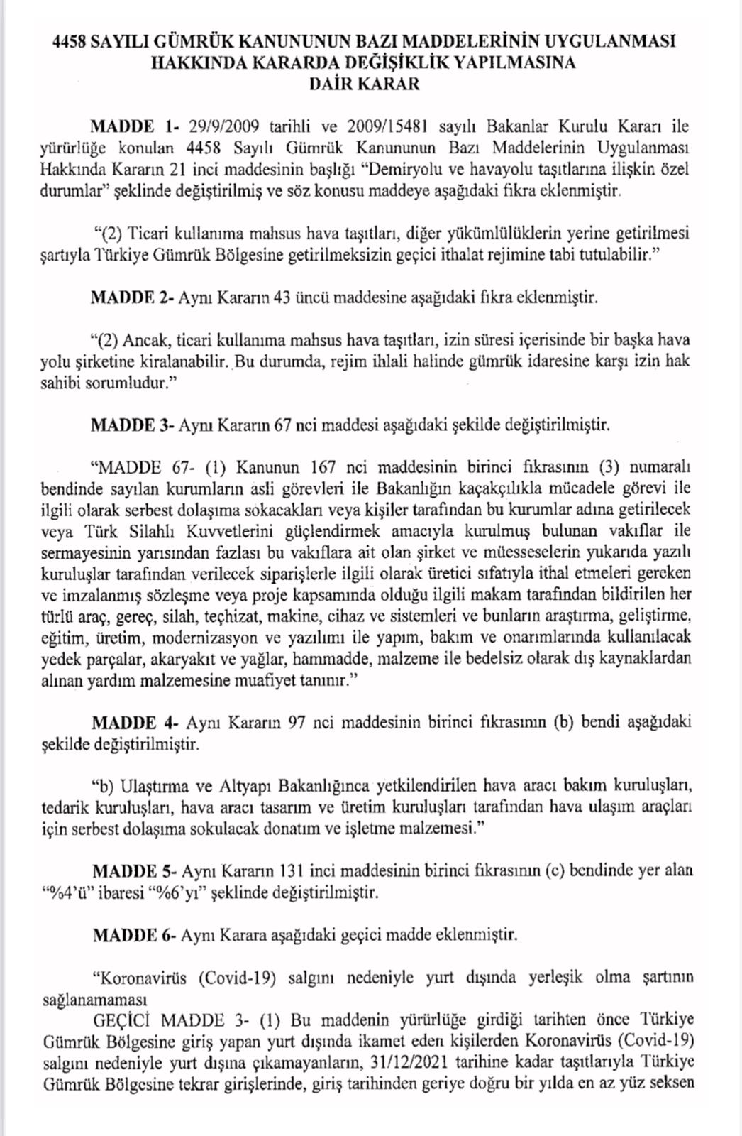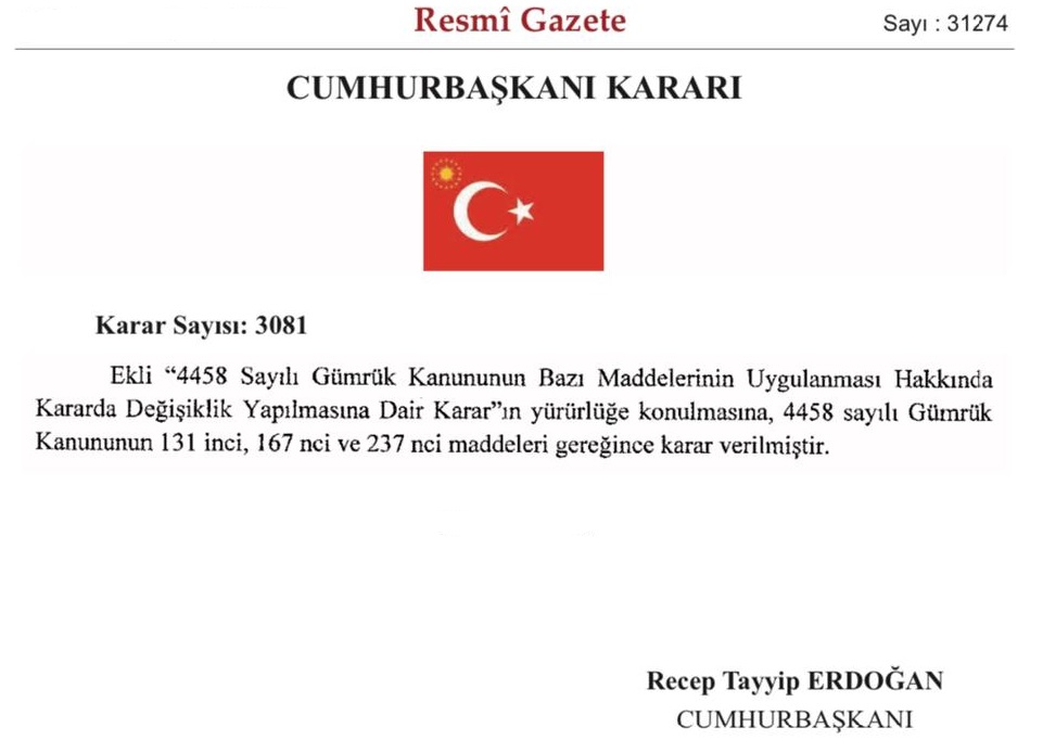 “4458 Sayılı Gümrük Kanunu’nun Bazı Maddelerinin Uygulanması Hakkında Karar’da Değişiklik Yapılmasına Dair Karar Resmi Gazete’de yayımlanarak yürürlüğe girdi.