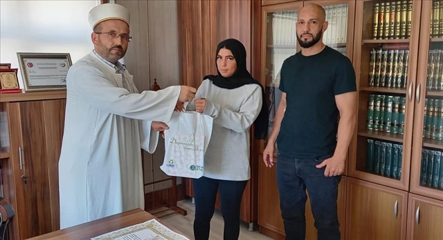 Çifti evinde misafir eden Bölücek köyü muhtarı İsmail Yavuz da Alman geline Kur'an-ı Kerim hediye etti.